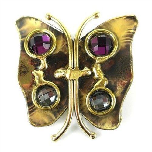 Accented with purple and grey man-made crystals, this brass brooch created by South African artisans is in the shape of a butterfly. The coloration of the brass is achieved by applying high heat rather than paints or dyes.