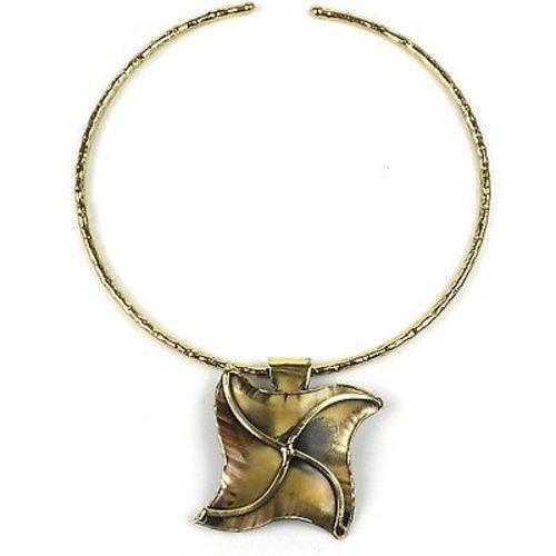 Handcrafted in South Africa, this necklace is comprised of a 2-inch tall brass pinwheel pendant with a self bale and a 15-inch long hammered open brass hoop. The pendant's coloration is achieved with high heat rather than paints or dyes.