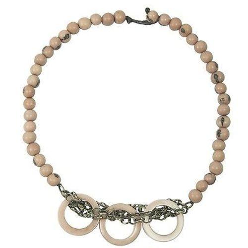 The circle chain choker includes acai and pambil seeds with carved tagua nuts on a metal chain. Handcrafted by artisans, it is one of a kind featuring natural and urban materials combined in an easy-to-wear 18-inch choker.