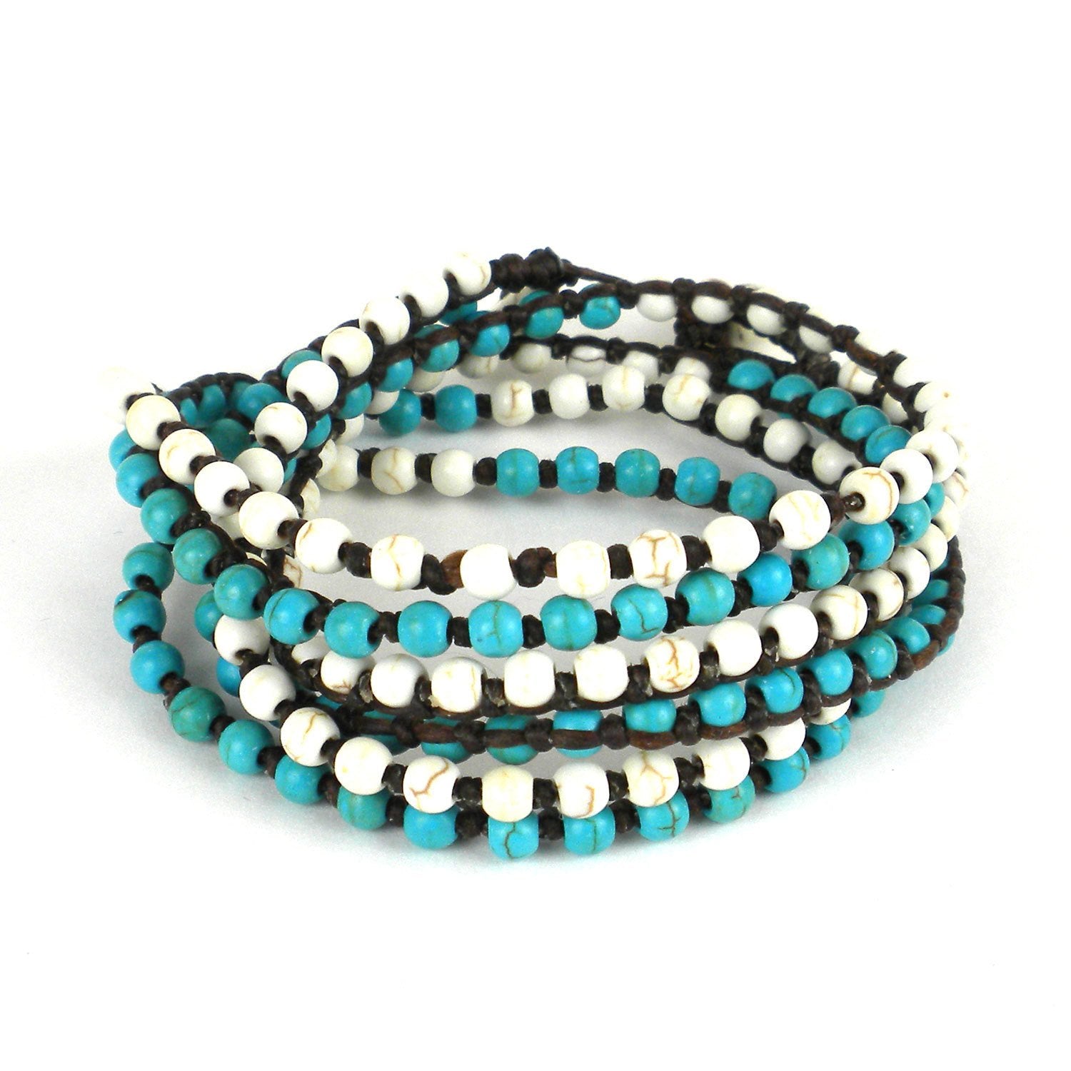 Turquoise and howlite combine for this ice-and-snow-inspired 23-inch wrap bracelet strung on waxed cotton. Ball-loop adjustable closure.