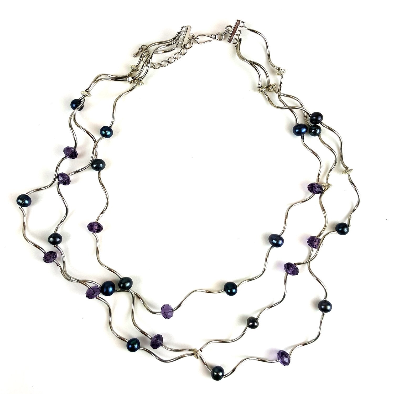 Wavy inch long silver beads are mixed with iridescent black freshwater pearls, purple crystals and silver beads in a unique 3 strand necklace. The necklace is 17 inches long and has a hook and eye closure with a 1-inch extension chain.
