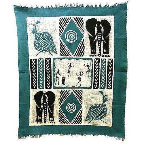 Batiked and painted by hand, this vertically-oriented barkweave cotton wall hanging has elephants, guinea fowl and African dancers. It measures 29.5 by 39 inches (75cm X 1 M).