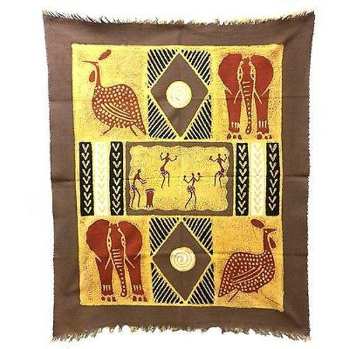Batiked and painted by hand, this vertically-oriented barkweave cotton wall hanging has elephants, guinea fowl and African dancers. It measures 29.5 by 39 inches (75cm X 1 M).