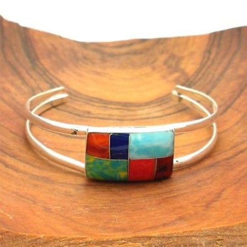 This Rectangular Mosaic Stone Bracelet with Inlaid stone mosaic measures 1 inch wide by 0.625 inches tall. Bracelet measures 6 inches from end to end. Alpaca silver handmade in Mexico.